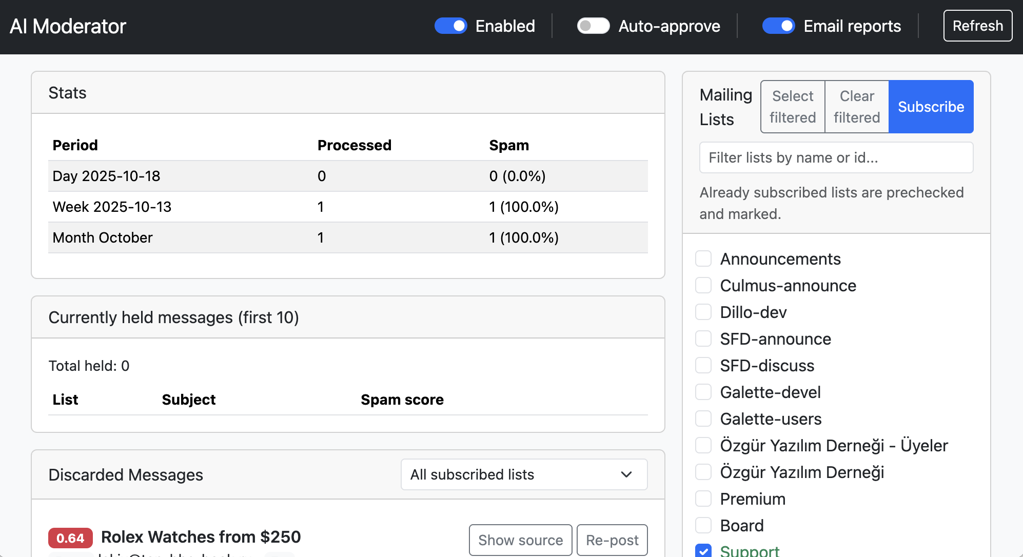 | ![]() | Mailman 3 SaaSAI ModeratorAI Moderator is a custom app by Mailman3.com that automates moderator activity for open policy lists that suffer from spam.